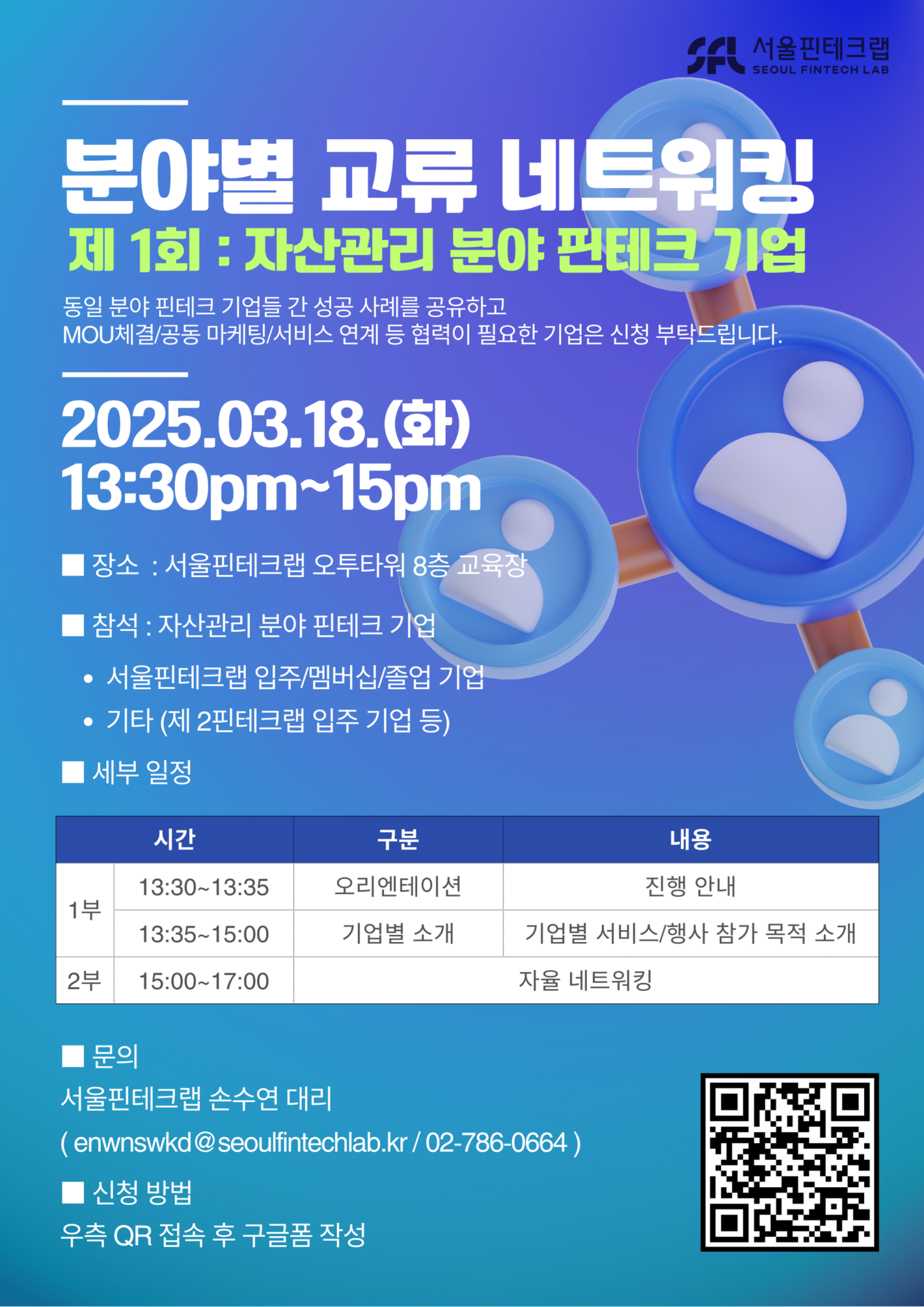 서울핀테크랩이 ‘제 1회 자산관리 분야 교류 네트워킹’을 개최한다.총 18개 기업이 참여할 예정이며, 서울핀테크랩 입주 및 졸업 기업 11개 (아이피샵, 블록에스, 빅테크플러스, 몰리턴, 리스크엑스, BISONAI, 276홀딩스, 펀블, 왓섭, 비씨랩스, 이노밧), 제2서울핀테크랩 입주 기업 5개 (업루트컴퍼니, 와이에스메타, 토리에듀