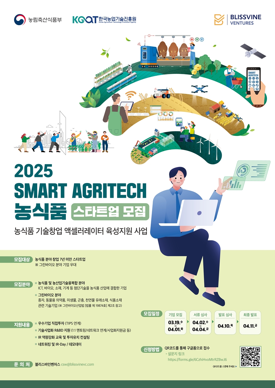 농식품 첨단기술기업 전문 투자사 블리스바인벤처스가 ‘2025 SMART AGRITECH’ 프로그램의 참여기업을 모집한다.농림축산식품부가 주최하고, 한국농업기술진흥원이 주관하는 이번 프로그램은 농식품 분야에서 혁신적인 기술을 보유한 설립 7년 미만 스타트업을 대상으로 한다. 특히 AI, 바이오, 신소재, 로봇 등 첨단기술을 접목한 농산업