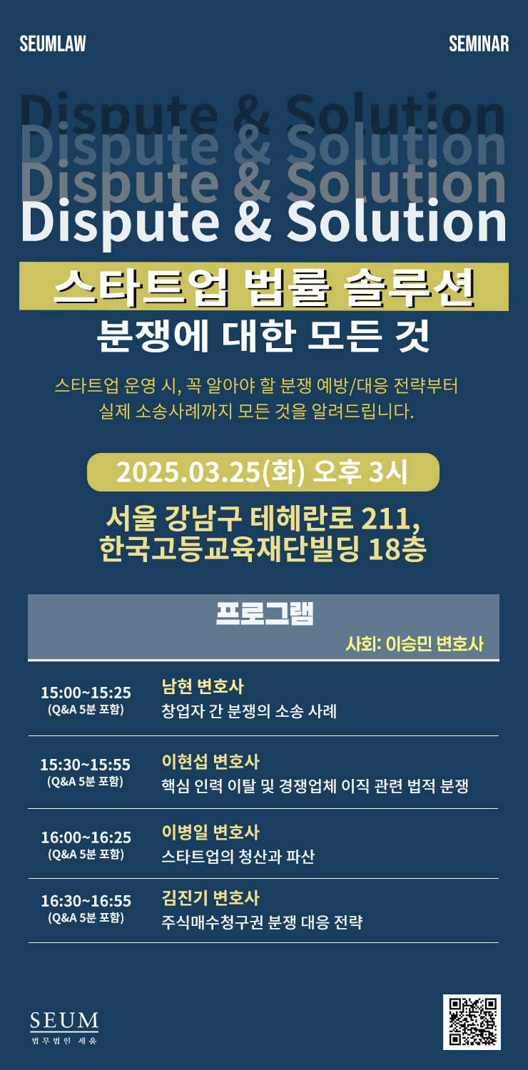 법무법인 세움이 ‘스타트업 법률 솔루션: 분쟁에 대한 모든 것’ 세미나를 개최한다.최근 기업 분쟁 사건이 급증하는 가운데, 세움은 스타트업 관계자들이 꼭 알아야 할 분쟁 예방 및 대응 전략을 공유하는 자리를 마련한다. 본 세미나에서는 실제 소송 사례를 바탕으로 창업자가 직면할 수 있는 다양한 법적 문제를 분석하고 실질적인 해결